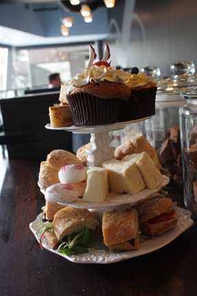 Includes: Mini Savoury Baguettes, a proper scone with lashings of clotted cream and jam, one of our signature cupcakes, marshmallow, a mini Valrhona brownie, a mini Belgian Blondie, and a mini meringue and of course a pot of