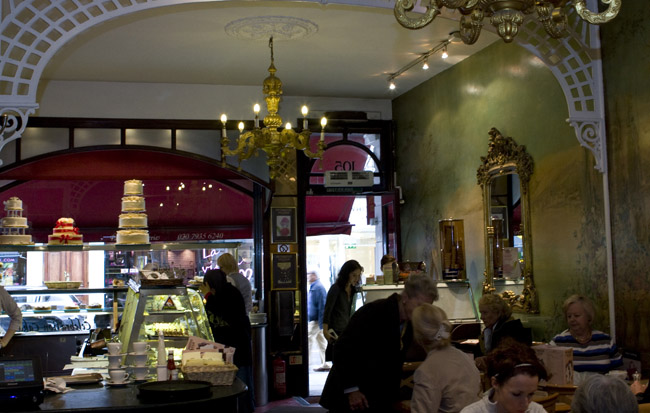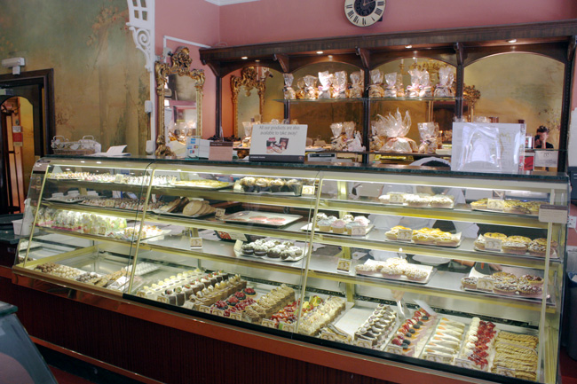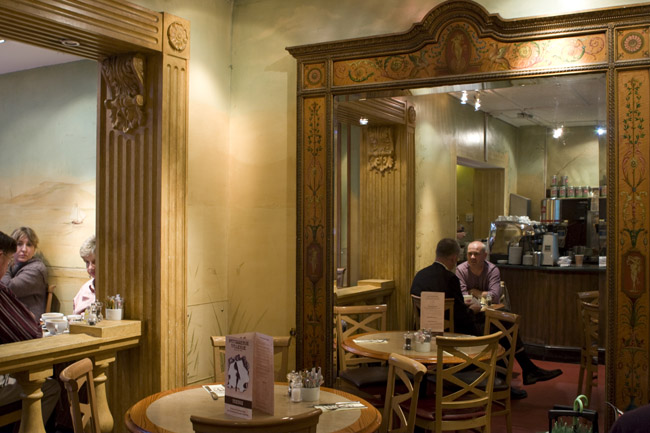 | This haven of self-indulgent handmade delights was founded by Belgian-born Madam Valerie in 1926. Today a British institution, Patisserie Valerie continues to offer delicious cakes, gateaux and pastries. Among its most popular choices is the apple tart, a butter pastry with an apple, sultana and cinnamon filling topped with sliced apples and an apricot glaze. The Mixed Berry Mousse is also a highlight and is comprised of a vanilla sponge base topped with layers of whipped cream mousse, berry glaze and fresh fruit. European in feel, the front window and inside counter is lined with sweet treats. Customers can enjoy desserts amid the opulent setting, which features prettily painted walls and decadent archways. A selection of teas and coffees accompanies the cakes. |